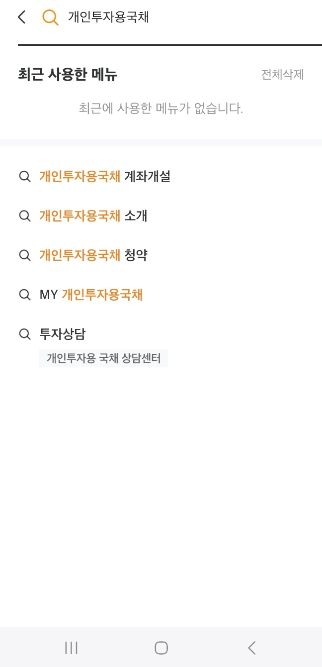 미래에셋증권 App을 다운로드한 후, 검색 창에 '개인투자용 국채'라고 입력하면 전용 계좌 개설부터 소개 및 청약 등 자세히 알아볼 수 있다.