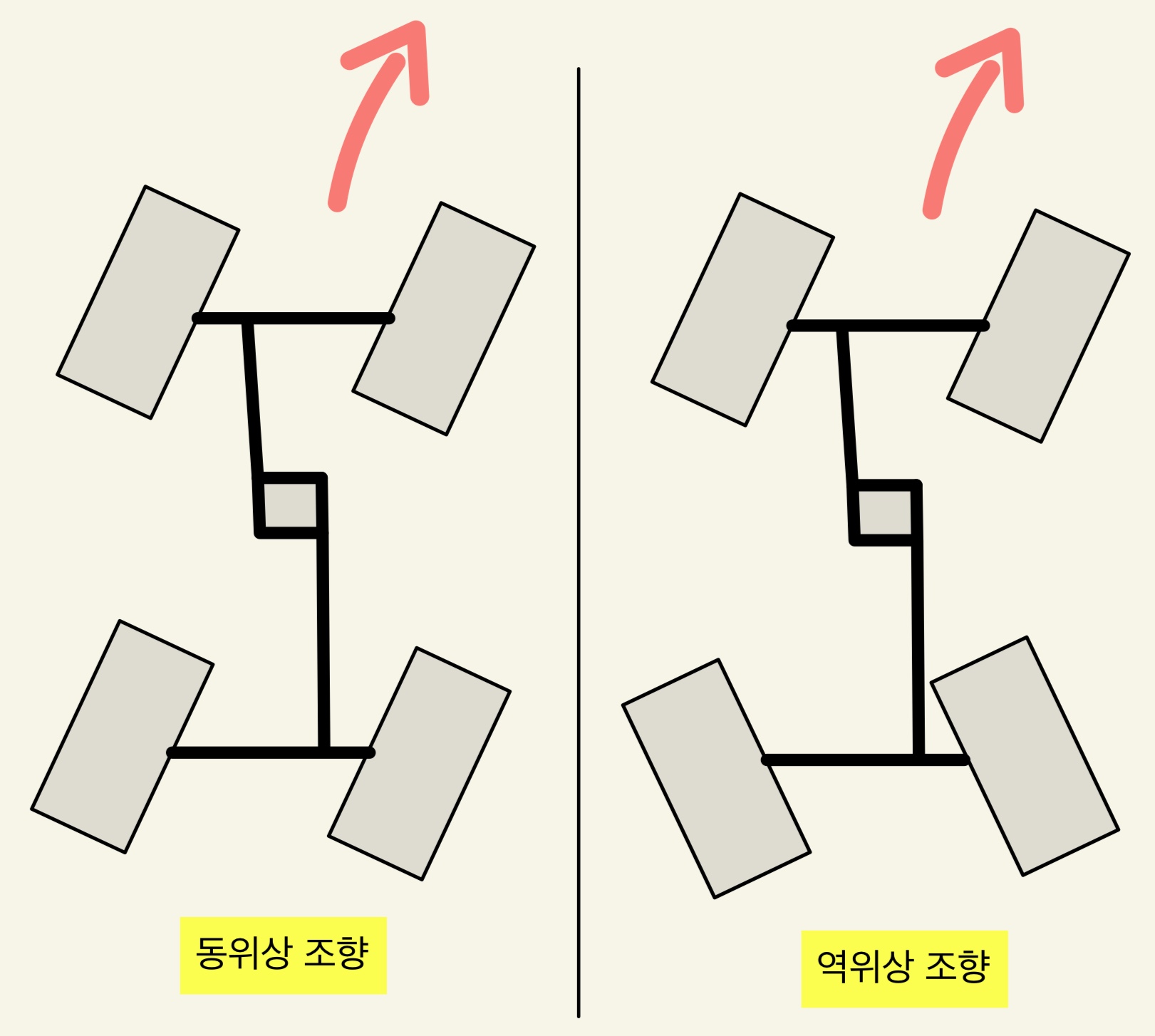 역위상 조향은 오른쪽 그림과 같이 앞바퀴가 조향 하는 반대 방향으로 뒷바퀴가 조향 하는 방식입니다. 이 방식은 저속에서 코너 주행 시 장점을 가집니다. 선회반경을 작게 만들어 좁은 곳에서 핸들링을 하는 수고를 덜어주어 주행을 제공합니다. 또한, 저속 주행 중 신속하게 이루어져야 하는 코너에서 빠른 반응성을 가집니다. 하지만 동위상 조향과 다르게 고속에서 완만한 선회에서는 안정성이 떨어질 수 있습니다.
