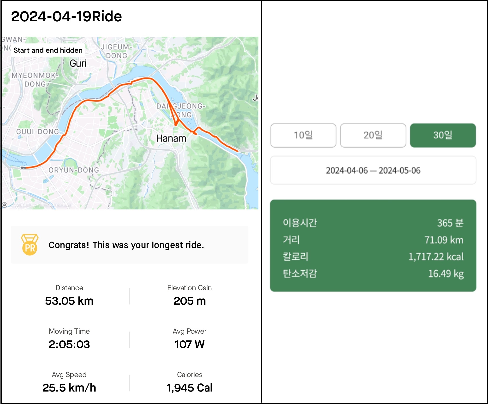 이제 실제로 자전거를 탔을 때 소모되는 칼로리를 보겠습니다. 사진 중 왼쪽 부분은 필자가 약 2시간 동안 로드바이크를 탔을 때의 데이터이고 오른쪽은 서울시 공용자전거를 탔을 때, 어플에서 볼 수 있는 데이터입니다. 서울시 공용자전거의 경우 일상용 자전거이기 때문에 빠른 속도를 내는 데 불리해 상대적으로 적은 칼로리를 소모했지만, 로드바이크를 타고 한강에서 약 2시간 주행했을 때 소모되는 칼로리는 약 2,000kcal에 가깝습니다. (참고로 필자의 몸무게는 약 61kg입니다.)